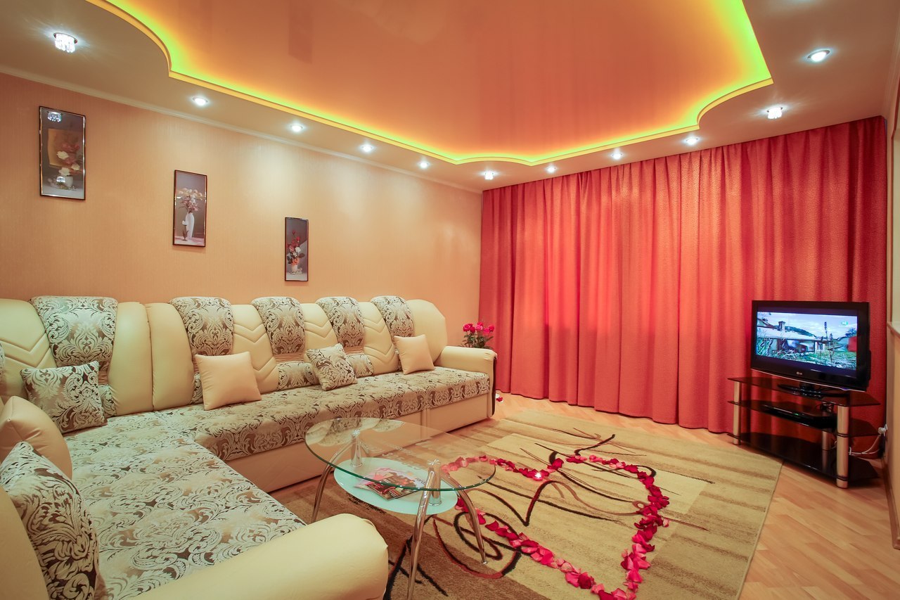 Сатиновые потолки занимают промежуточное положение между глянцевыми и матовыми: они имеют легкий блеск, но при этом не создают отражающий эффект. Такой вариант идеален для создания мягкой, спокойной атмосферы в зале.